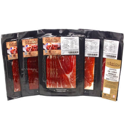 - ⭐1000gr JAMON IBERICO DE CEBO 50% RAZA IBERICA en lonchas. Jamon iberico loncheado. Pack de 10 sobres de 100gr. Envasado al vacío para mejorar la CONSERVACIÓN y mantener todo el sabor y aroma original. A veces llamado Pata negra.